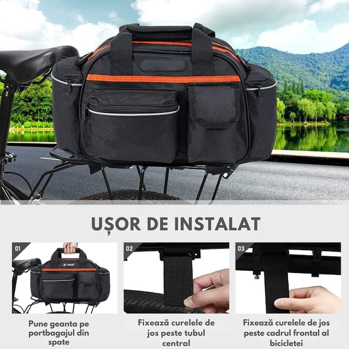 Geanta este echipata cu sisteme de atasare robuste, care o fixeaza ferm pe portbagajul bicicletei. Acest lucru garanteaza o stabilitate excelenta chiar si pe drumuri mai accidentate sau in conditii de vant puternic, astfel incat sa poti calatori fara griji, indiferent de traseul ales. In plus, geanta este prevazuta cu banda reflectorizanta, care asigura vizibilitate crescuta pe timp de noapte sau in conditii de iluminare slaba, sporind siguranta ta pe drumurile publice.