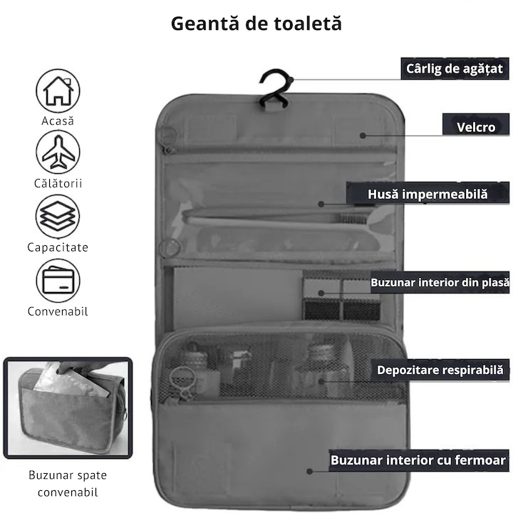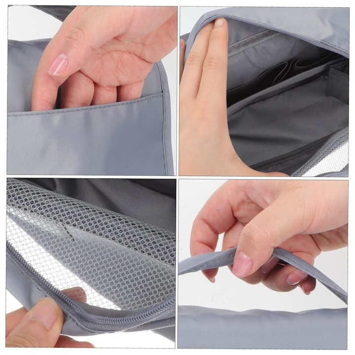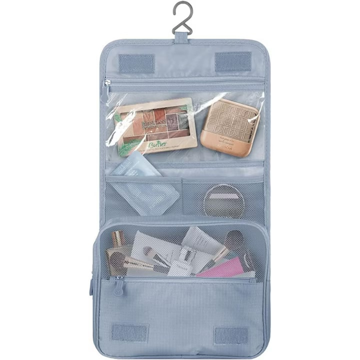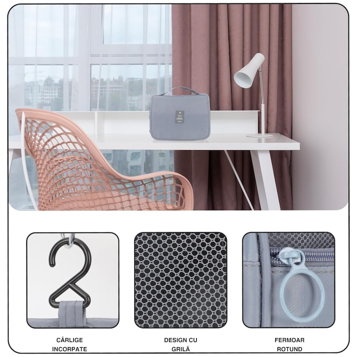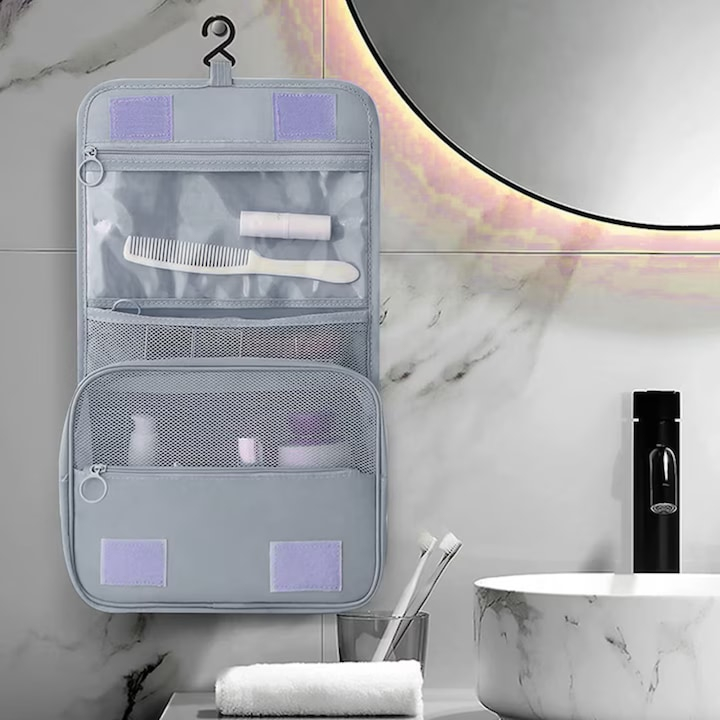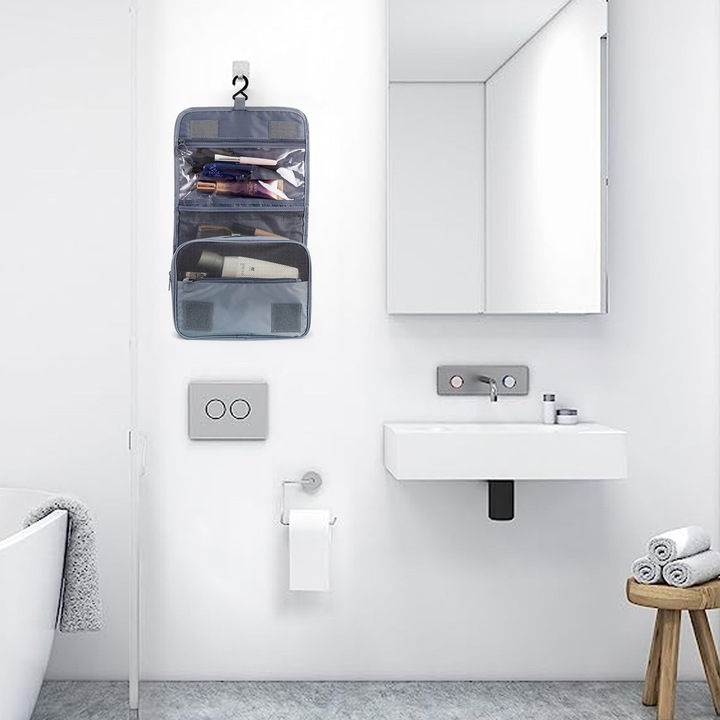 Organizatorul este prevazut cu un maner special, care iti permite sa il atarni de un carlig sau un suport, cum ar fi in baie sau pe usa dormitorului. Acest detaliu iti va oferi un acces rapid si usor la produsele tale cosmetice, chiar si atunci cand te grabesti sau ai nevoie de ele intr-o locatie mai dificila, cum ar fi intr-o gara sau intr-un camin studentesc.