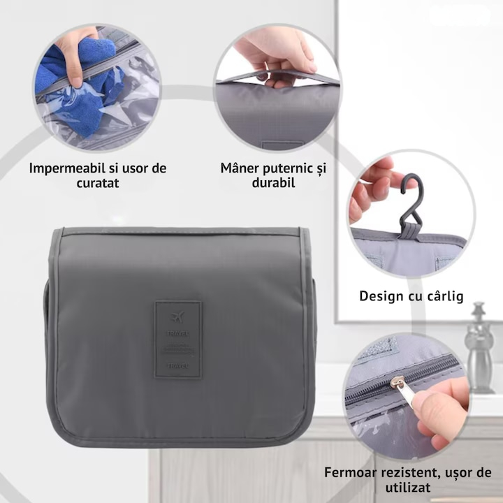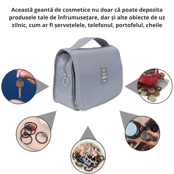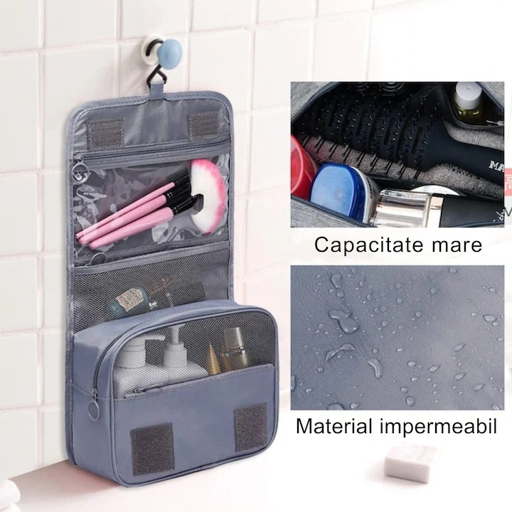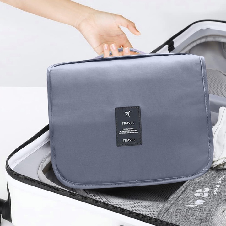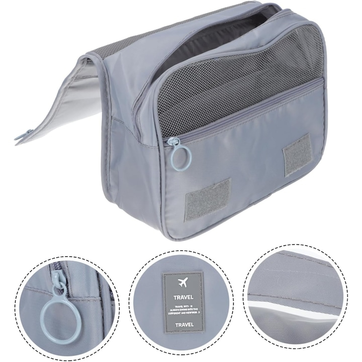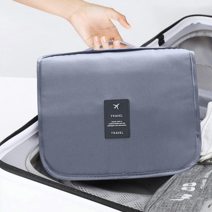 Geanta de Cosmetice VarioShop®, pentru Voiaj si Transport, Produse de Igiena Personala, Impermeabila, Design Compact, Pliabila, 21,5 cm x 24 cm x 8 cm, Gri