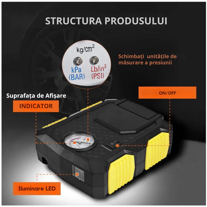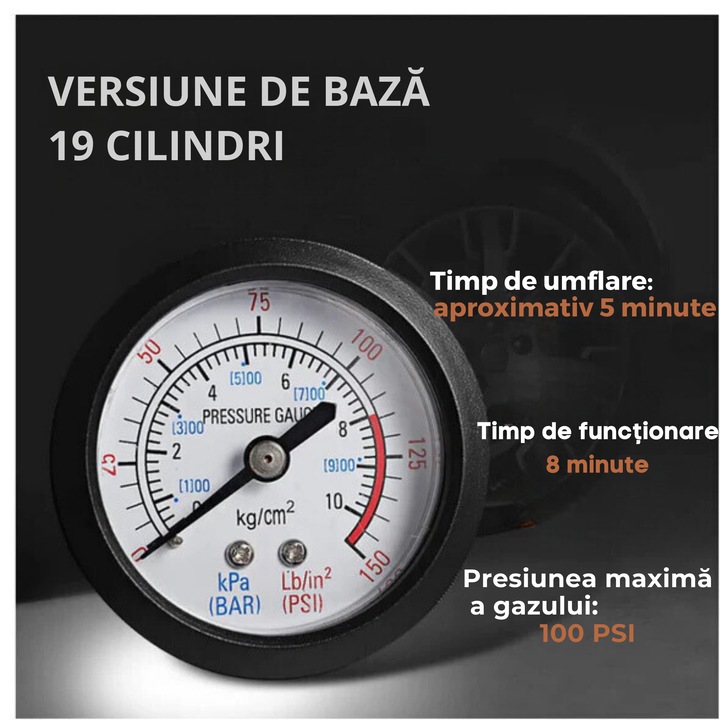 - Presiune Maxima: 150 PSI / 10 BAR - Ideal pentru anvelope auto, biciclete si alte accesorii gonflabile.
