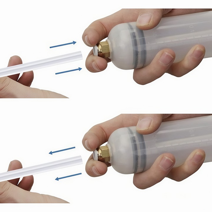 La capatul seringii se afla un piston special conceput pentru a crea un vid intern eficient, care aspira uleiul in mod curat si rapid. Acest sistem reduce riscul de contaminare si face ca intreaga operatiune sa fie mult mai igienica si sigura.