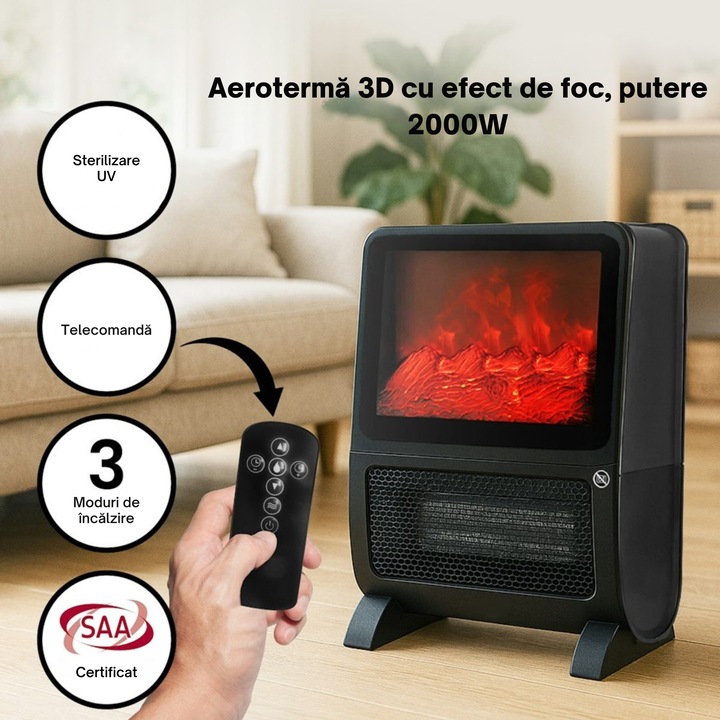 Aeroterma electrica cu efect de semineu 3D VarioShop®, 2000W, flacara realista, incalzire rapida, telecomanda, timer 1–8h, protectie la supraincalzire