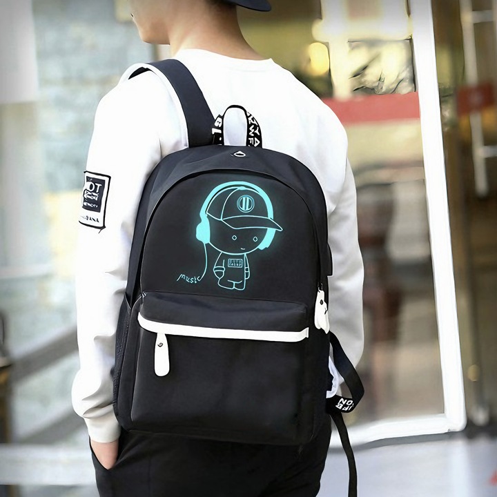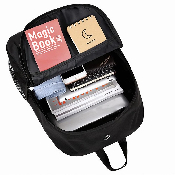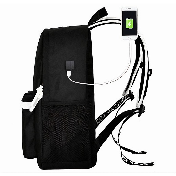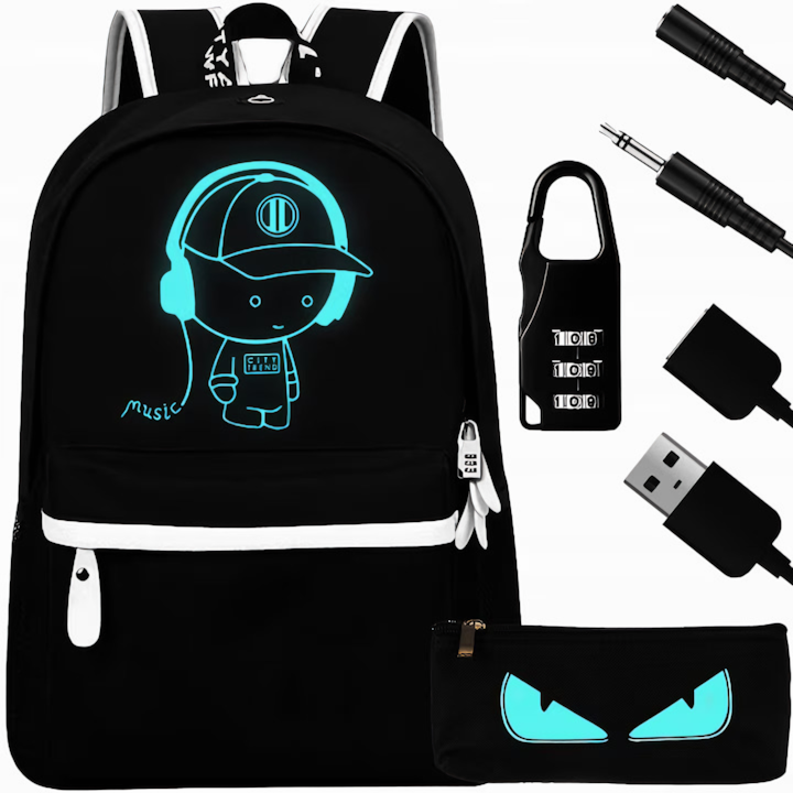 VarioShop® Ghiozdan Pentru Adolescenti VarioShop®, cu Design Fosforescent, Prelungitor Incarcare USB, Mufa Jack pentru Casti, Lacat cu Cifru, Penar, Waterproof, Pentru Scoala, Drumetii si Munte 42x14x33 cm, Negr