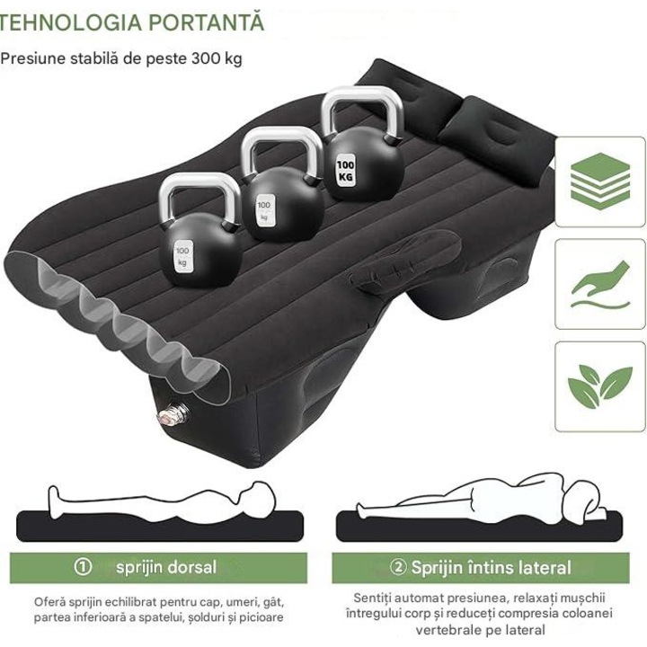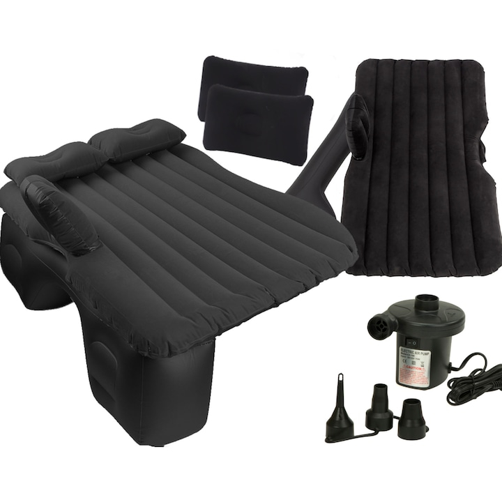 Saltea auto gonflabila cu suport integrat VarioShop®, pompa electrica 12V, 2 perne si husa, pat portabil pentru masina, sarcina maxima 300 kg, ideala pentru calatorii si camping, 130 x 80 cm, Negru