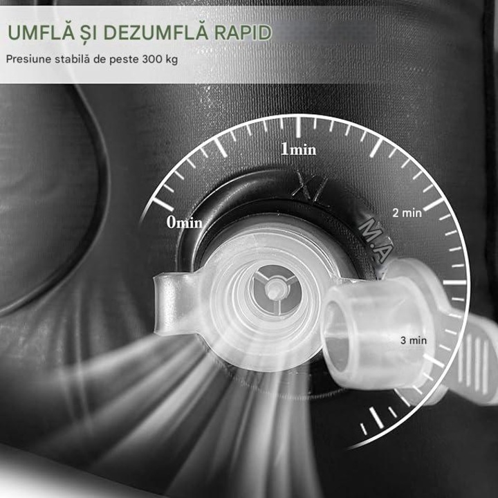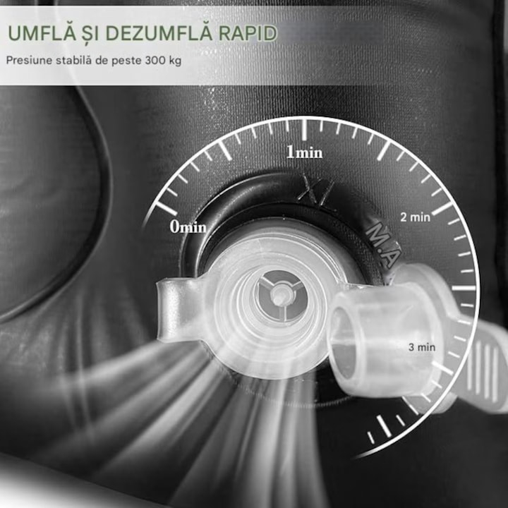 Setul include o pompa electrica care se conecteaza la priza de bricheta a masinii. Umflarea dureaza doar cateva minute, fara efort suplimentar. La final, se dezumfla si se impacheteaza intr-o husa de transport inclusa.