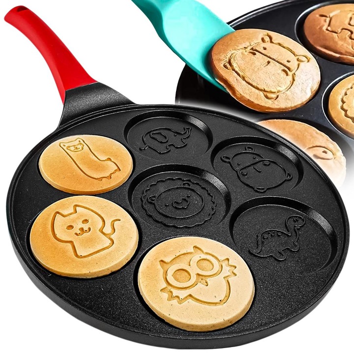 Design Amuzant cu 7 Modele de Animalute: Pregateste clatite cu modele de pisoi, bufnita, dinozaur, hipopotam, elefant, lama si leu, aducand zambete pe fetele celor dragi.