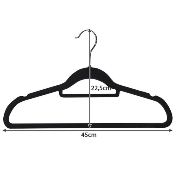 Datorita acoperirii cu velur de inalta calitate, umerasele asigura ca hainele nu vor aluneca sau cadea, pastrandu-le pe loc, chiar si pe cele mai alunecoase materiale, precum matasea sau satinul.