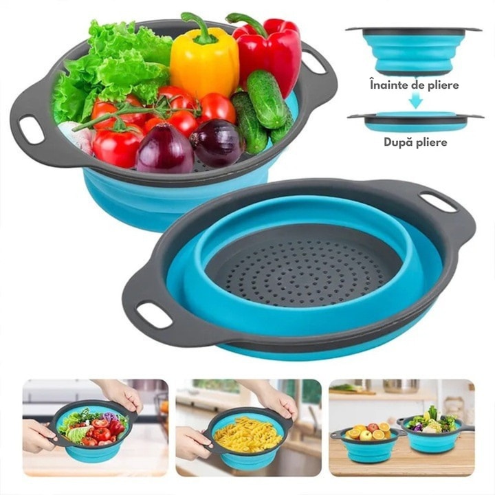 Unul dintre cele mai mari avantaje ale acestui set este designul pliabil. Cand nu sunt folosite, strecuratoarele se pliaza complet, ajungand la o inaltime de doar 3-3,5 cm. Asta inseamna ca pot fi depozitate cu usurinta in orice sertar sau dulap, economisind spatiu pretios in bucatariile mai mici sau in rulote, corturi, cabane ori garsoniere.