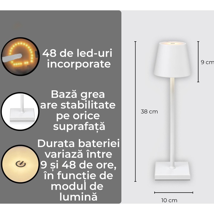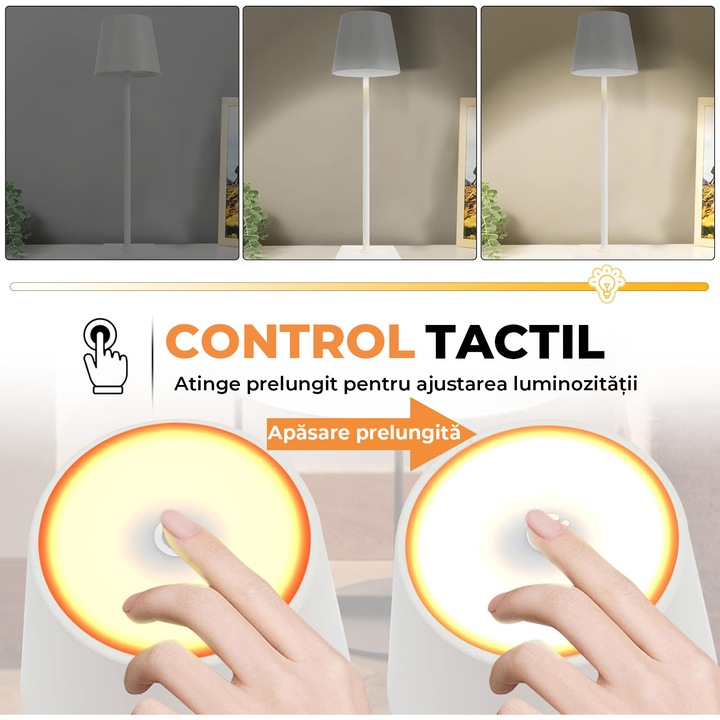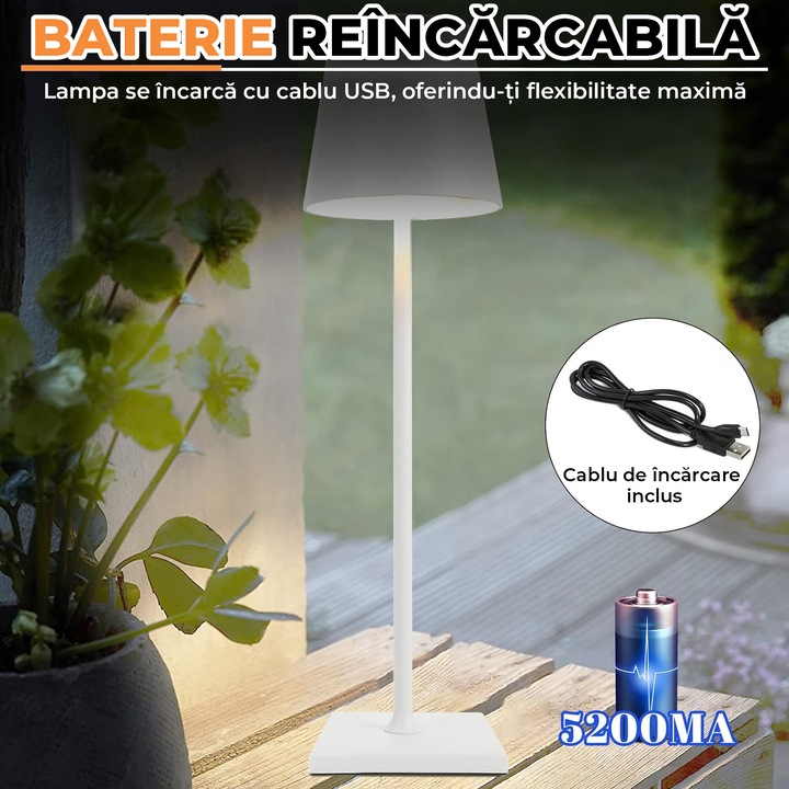 - Portabilitate si Versatilitate: Fiind fara fir, aceasta lampa poate fi mutata cu usurinta, fiind ideala atat pentru birou, sufragerie sau chiar la exterior, in cadrul petrecerilor.