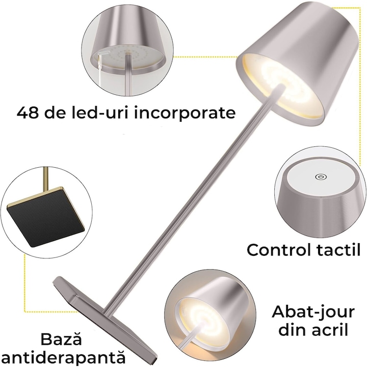 • Portabilitate si Versatilitate: Fiind fara fir, aceasta lampa poate fi mutata cu usurinta, fiind ideala atat pentru birou, sufragerie sau chiar la exterior, in cadrul petrecerilor.